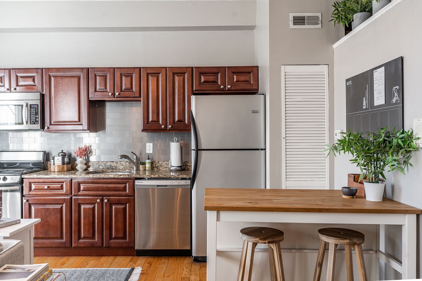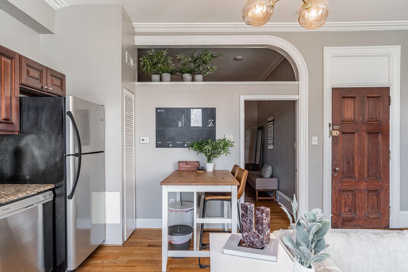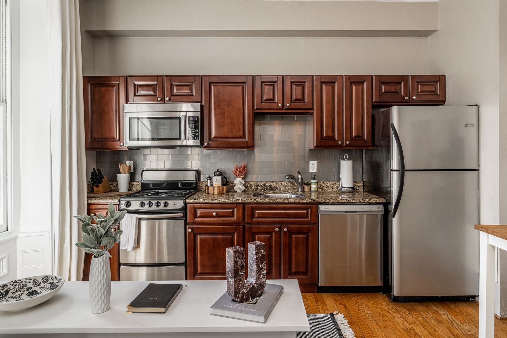 The apartment is fully equipped for a seamless stay, whether you’re here for a weekend getaway or an extended visit. Enjoy a well-stocked kitchen, cozy living area with streaming TV, in-building laundry, and a queen bedroom designed for restful nights. You’ll also find hotel-quality linens, Malin + Goetz bath products, and thoughtful touches throughout. All utilities—including high-speed WiFi, electricity, heat, and water—are included.