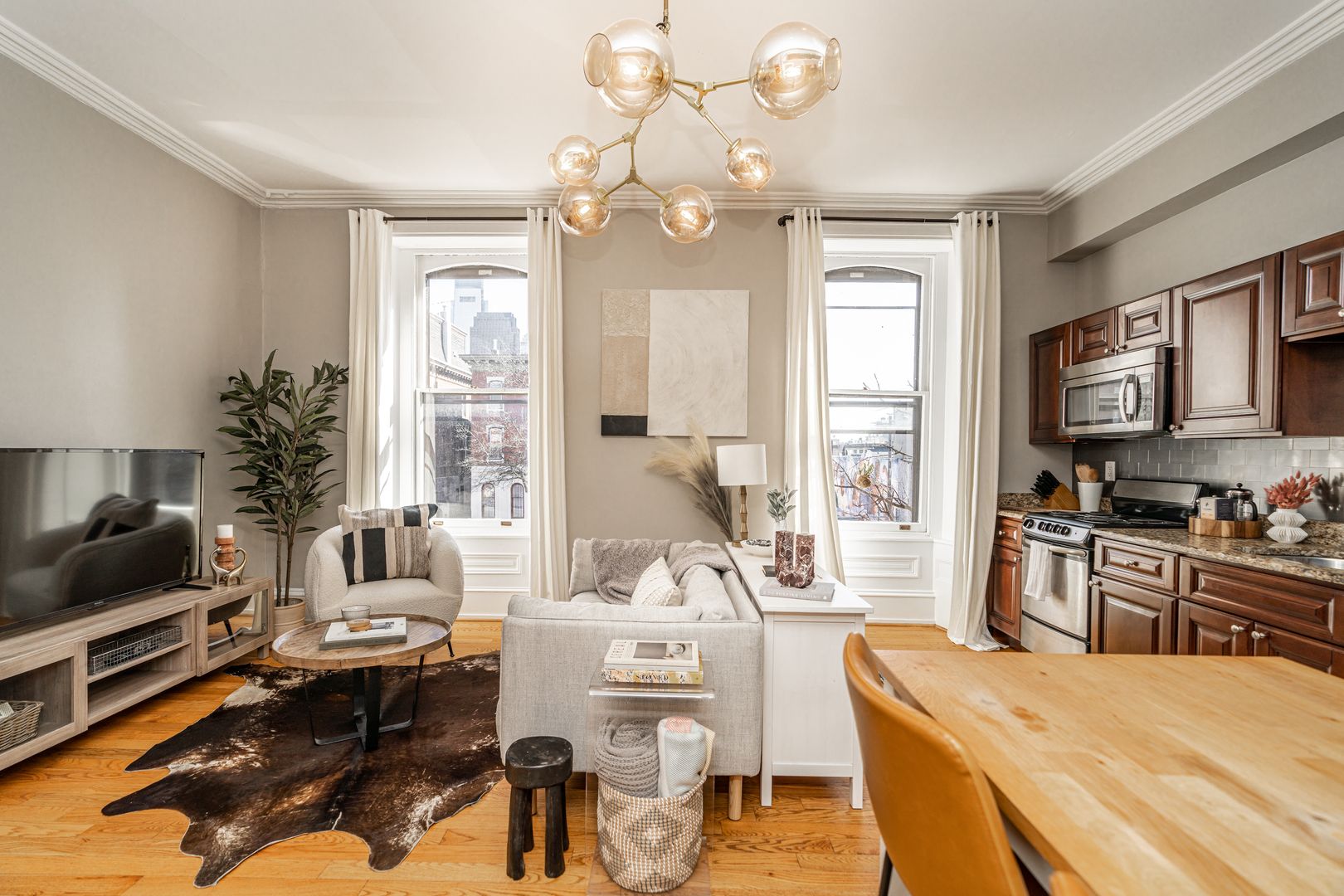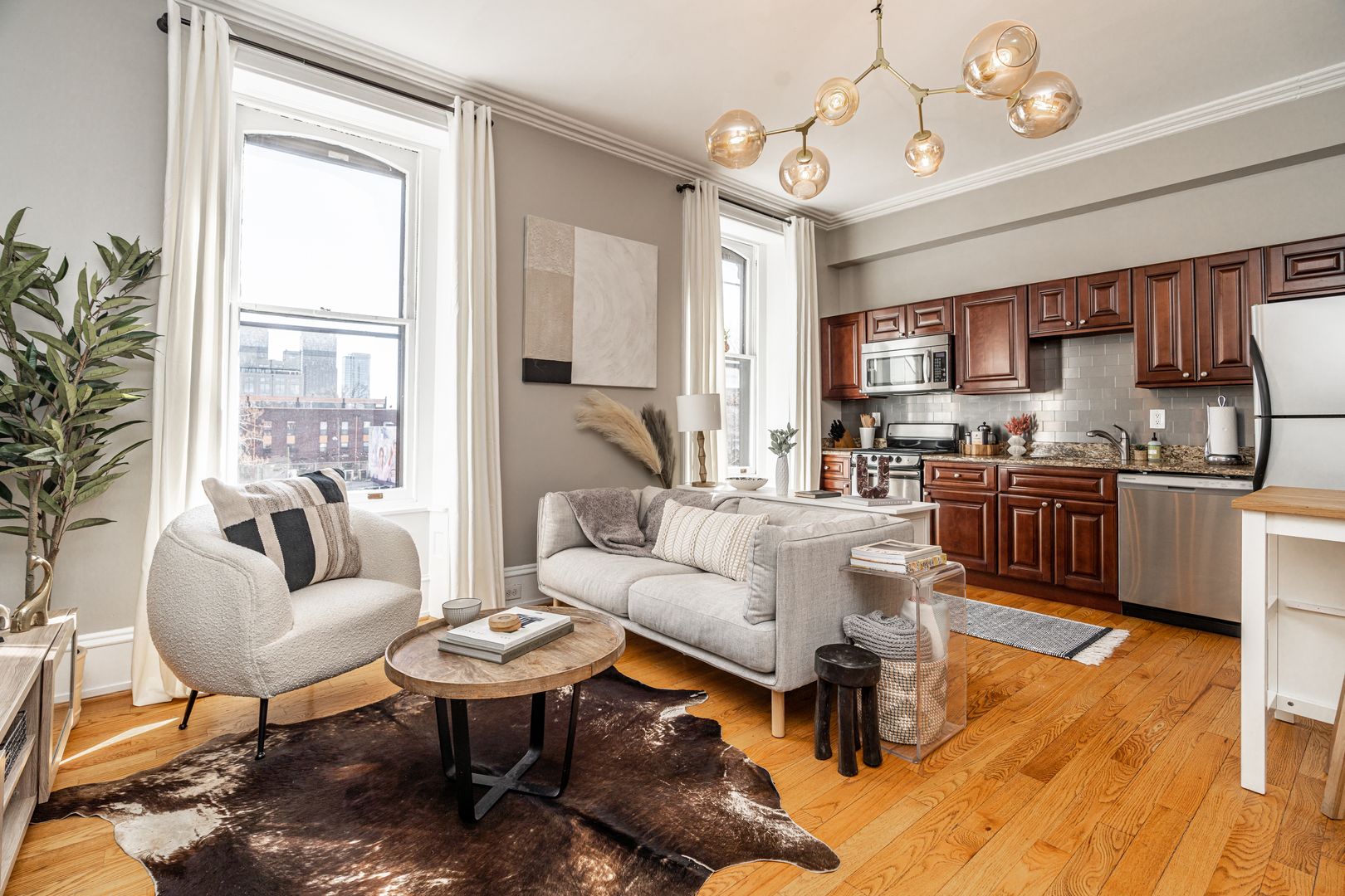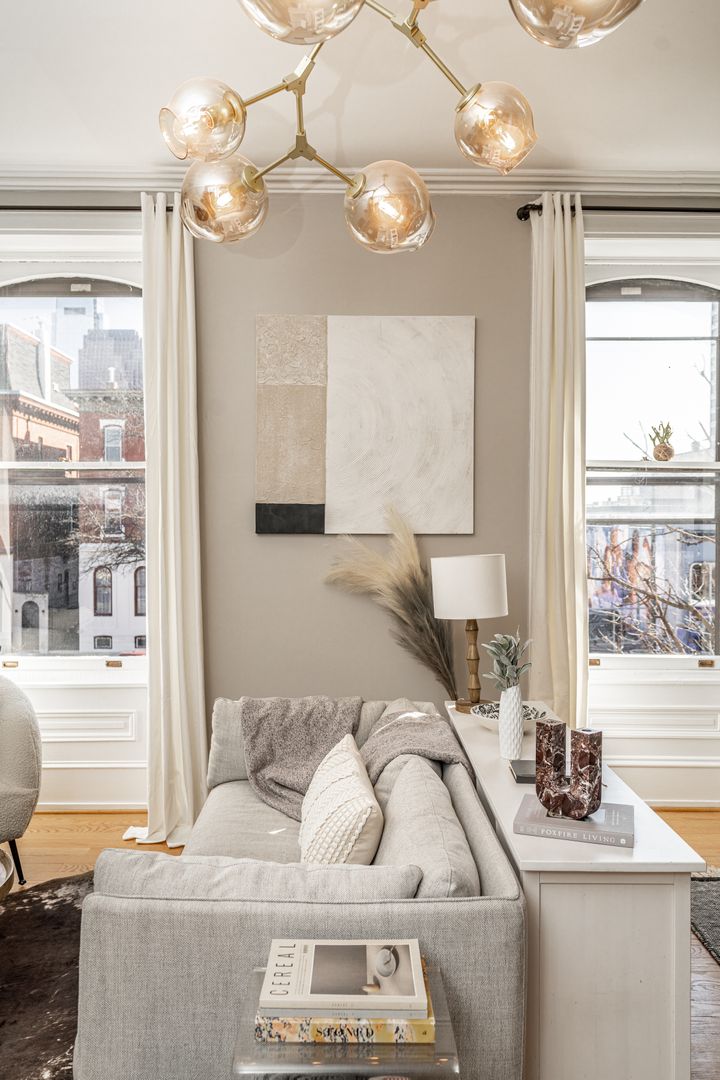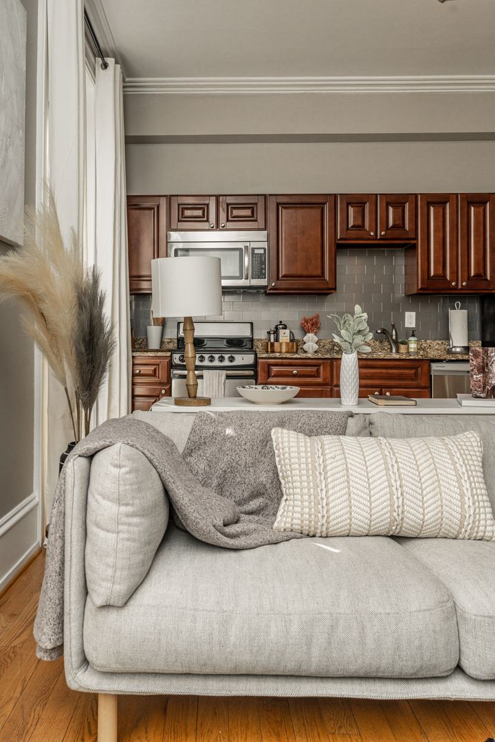 Step inside to soaring ceilings, warm hardwood floors, and oversized windows that fill the space with natural light. The layout is clean, calm, and intentional designed to feel both elevated and comfortable after a day in the city.