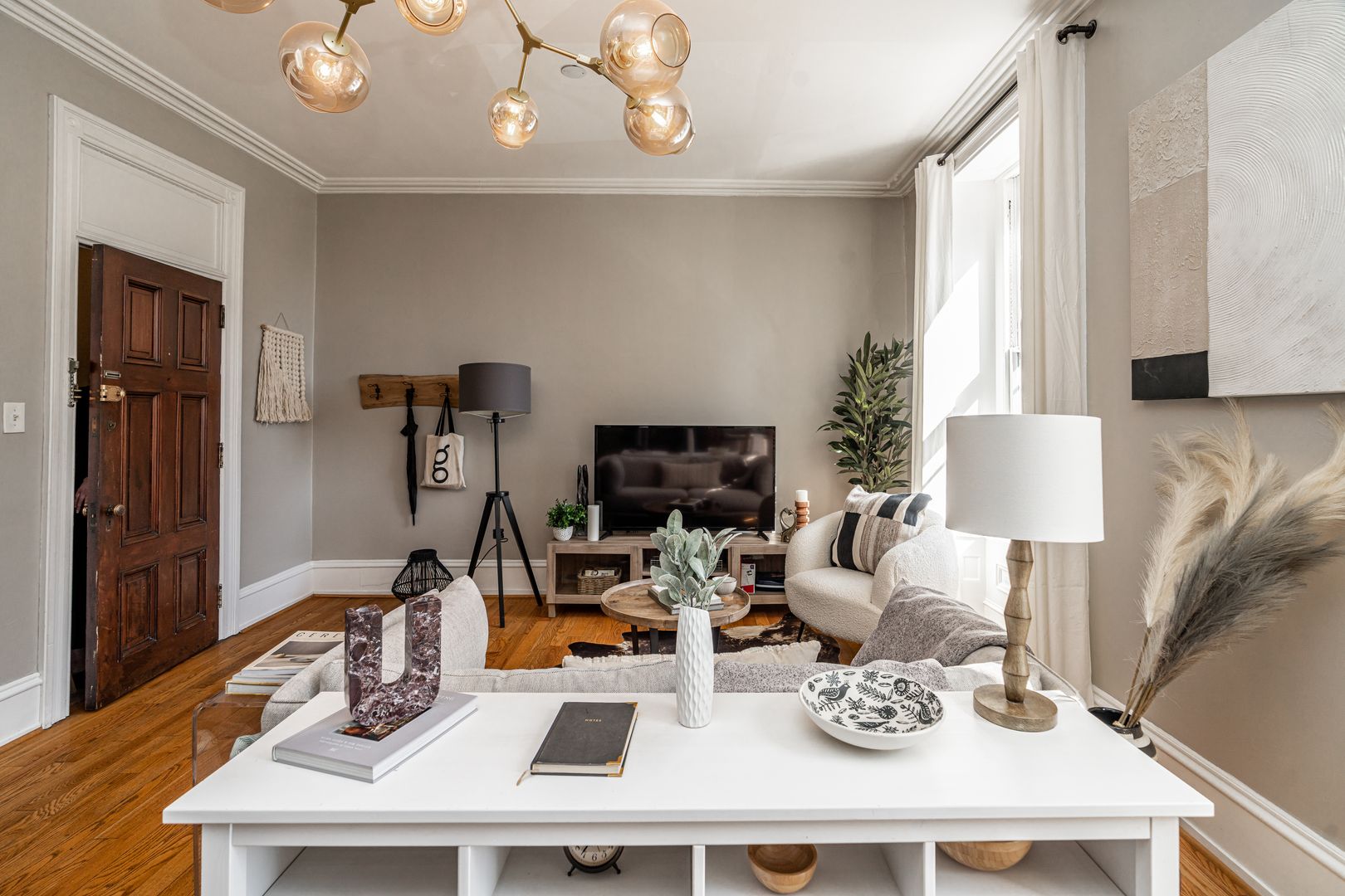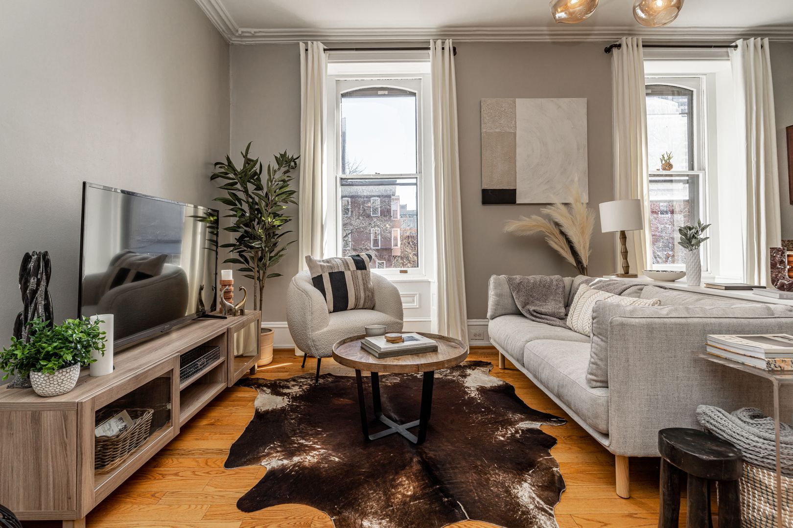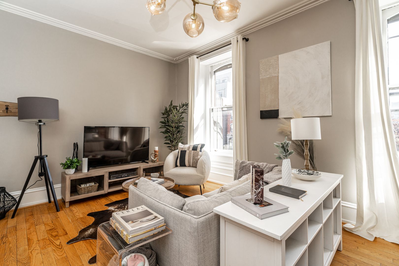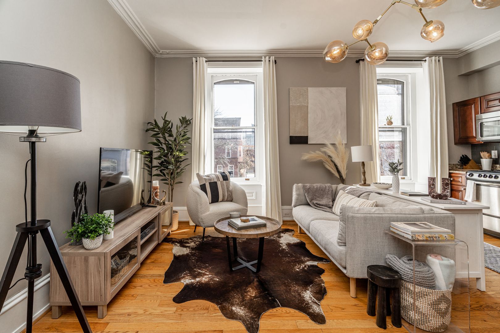 Step inside to soaring ceilings, warm hardwood floors, and oversized windows that fill the space with natural light. The layout is clean, calm, and intentional designed to feel both elevated and comfortable after a day in the city.